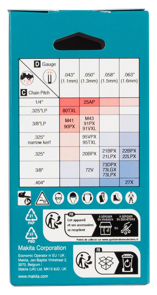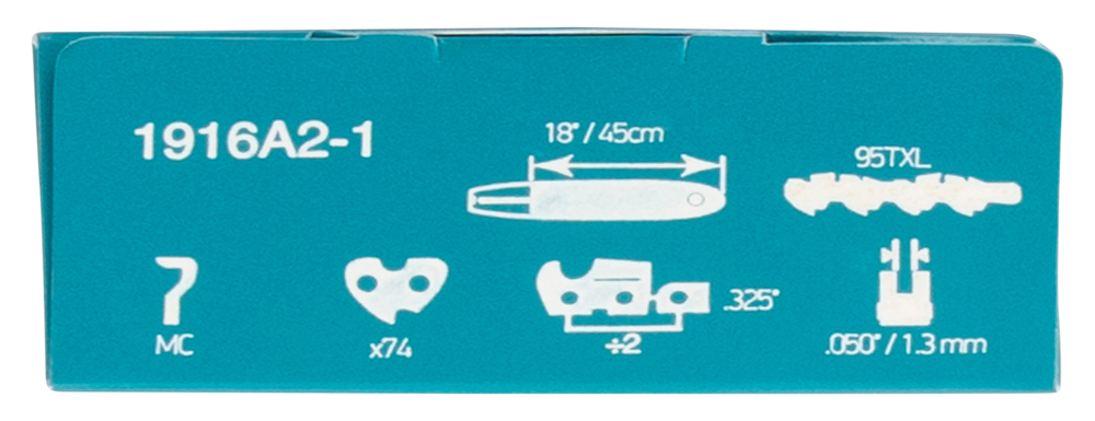Ketjusahan teräketjun Makita 1916A2-1 pituus on 18" (45 cm), vetolenkkien määrä 74 jaolla 0,325" ja uraleveys 1,3 mm.Tekniset tiedot: