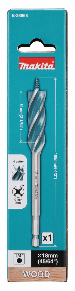 E-26668Nelileikkuinen puuporanterä 1/4" kiinnityksellä. Halkaisija 18 mm, kokonaispituus 165 mm, työskentelypituus 49 mm.