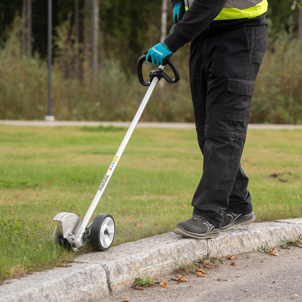 Tehokas ja helppokäyttöinen rajaaja/reunaleikkuri Makita XGT -akkutuoteperheeseen. Tukipyörää säätämällä voidaan rajaussyvyyttä säätää helposti välillä 0-59 mm. Tukipyörä tekee rajaamisesta helppoa ja tarkkaa. Kulmavaihde on suojattu maakosketukselta suojalevyllä.Yhdellä 5,0 Ah akulla käyttöaika on noin 18 minuuttia, riippuen toki maa-aineksesta. Teräsuojus suojaa käyttäjää lentäviltä partikkeleilta, mutta suo kuitenkin hyvän näkyvyyden työskentelyalueelle.